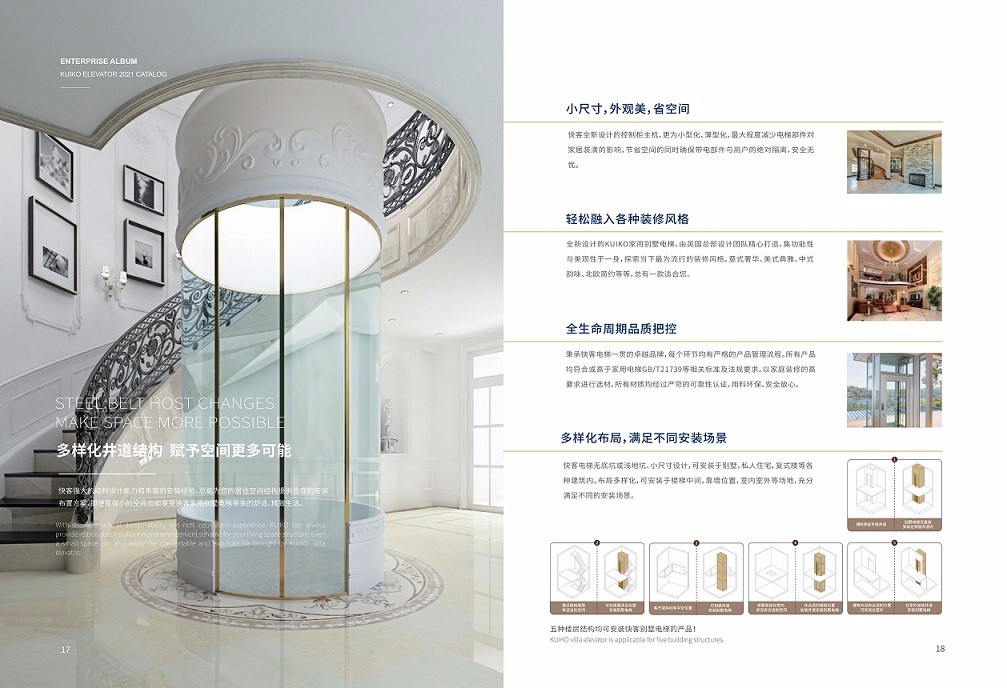 天津市洋郡電梯有限公司代理的電梯品牌,品質帶給您的優越感,不僅在于外觀,更在于其強大的內在。 家用別墅電梯,私人定制,多樣化裝潢配置給您的家居帶來不一樣的體驗 安裝便捷無需獨立機房,自帶一體化井道。安裝非常簡便,只需一周左右即可完成,而且可以直接安裝在已經完成裝修的地板上而不破壞現有裝修。